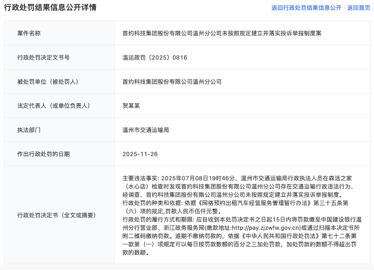 海报新闻记者近日报道,温州市交通运输局对首粤科技集团有限公司温州分公司(以下简称“首粤科技温州分公司”)给予行政处分。未按照规定建立并执行投诉举报制度的,依法处以5000元罚款。官方处罚信息显示,2025年7月8日19时46分,温州市交通运输局行政执法人员在对宣化子楼(水心店)检查时发现首悦科技温州分公司存在违法运输行政违法行为。经执法部门进一步调查核实,该公司在业内未建立并执行规定的投诉举报制度,违反相关规定。基于以上所述事实证明,2025年11月26日,温州市交通运输局依据《网络预约出租车运营服务暂行管理办法》第三十五条第六款的规定,对首约科技温州分公司作出行政处罚决定书,处以5000元罚款。公开资料显示,首悦科技温州分公司是母公司首悦科技集团有限公司的分公司,首悦科技集团有限公司是北京国资管理的子公司。成立于2015年,注册资本2亿元,实收资本2亿元。法定代表人为梁峰先生。我们的主营业务是互联网及相关服务,我们的主要品牌是“首汽调度”。